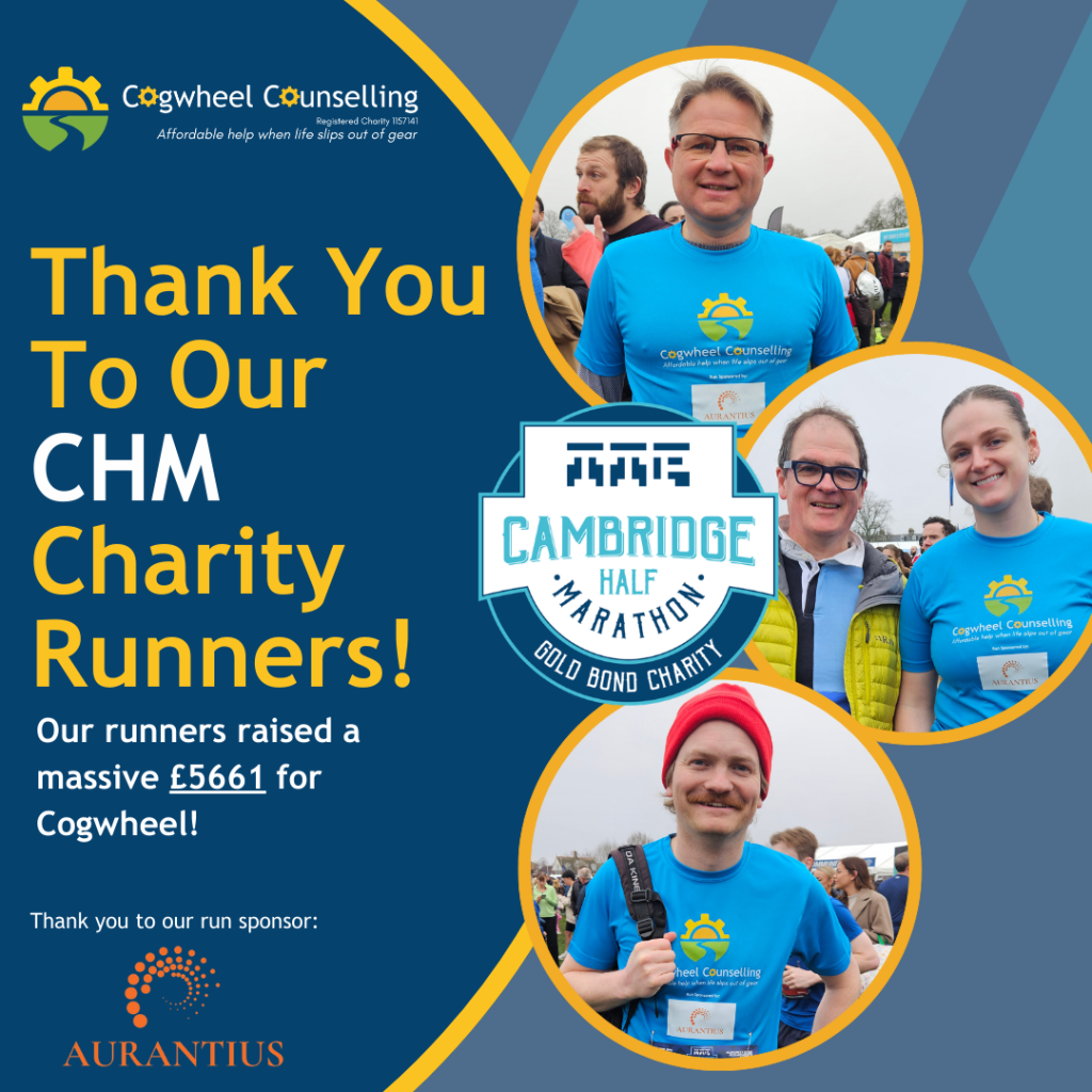 This year, six amazing runners took on the Cambridge Half Marathon to raise funds for Cogwheel Counselling. Together they raised an incredible £5,661 to help provide affordable counselling for people across Cambridgeshire.