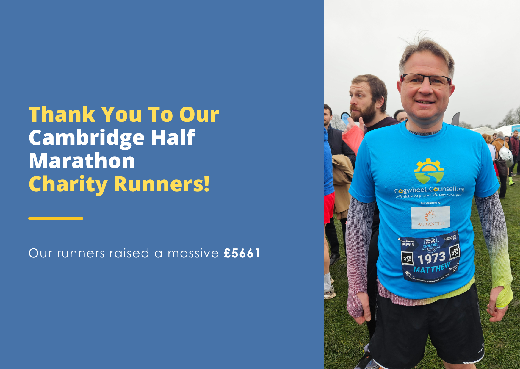 A huge thank you to our incredible Cambridge Half Marathon runners! This year, six amazing runners took on the Cambridge Half Marathon to raise funds for Cogwheel Counselling. Together they